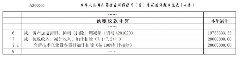 第一步:在《中華人民共和國企業(yè)所得稅月(季)度預(yù)繳納稅申報表(A類)》(A200000)和《資產(chǎn)加速折舊、攤銷(扣除)優(yōu)惠明細表》(A201020)相關(guān)行次填報稅前一次性扣除情況。通過手工申報的,根據(jù)設(shè)備、器具購進情況,在《資產(chǎn)加速折舊、攤銷(扣除)優(yōu)惠明細表》(A201020)第2行“二、一次性扣除”下的明細行次中,分別填寫“高新技術(shù)企業(yè)購進單價500萬元以下設(shè)備、器具一次性扣除”和“高新技術(shù)企業(yè)購進單價500萬元以上設(shè)備、器具一次性扣除”事項及其具體信息。填報完成后,將“納稅調(diào)減金額”列次的合計值(第3行第5列)同步填寫在《中華人民共和國企業(yè)所得稅月(季)度預(yù)繳納稅申報表(A類)》(A200000)第6行“資產(chǎn)加速折舊、攤銷(扣除)調(diào)減額(填寫A201020)”中。通過電子稅務(wù)局申報的,可在《資產(chǎn)加速折舊、攤銷(扣除)優(yōu)惠明細表》(A201020)的下拉菜單中選擇相應(yīng)的優(yōu)惠事項,并填寫具體信息,申報系統(tǒng)將同步自動填報《中華人民共和國企業(yè)所得稅月(季)度預(yù)繳納稅申報表(A類)》(A200000)第6行“資產(chǎn)加速折舊、攤銷(扣除)調(diào)減額(填寫A201020)”。第二步:在《中華人民共和國企業(yè)所得稅月(季)度預(yù)繳納稅申報表(A類)》(A200000)第7行“減:免稅收入、減計收入、加計扣除”下的明細行次填報加計扣除情況。手工申報的,在明細行次填寫“高新技術(shù)企業(yè)設(shè)備、器具加計扣除(按100%加計扣除)”事項及加計扣除金額。通過電子稅務(wù)局申報的,申報系統(tǒng)自動填報相關(guān)事項及加計扣除金額。
