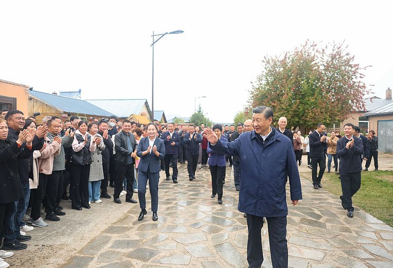 9月6日至8日,中共中央總書記、國家主席、中央軍委主席習近平在黑龍江考察。這是6日下午,習近平在大興安嶺地區(qū)漠河市北極村考察時,同當?shù)厝罕娪H切交流。新華社記者 鞠鵬 攝
