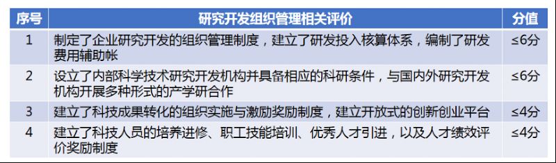 由技術(shù)專家根據(jù)企業(yè)研究開發(fā)與技術(shù)創(chuàng)新組織管理的總體情況,結(jié)合以下幾項評價,進行綜合打分: