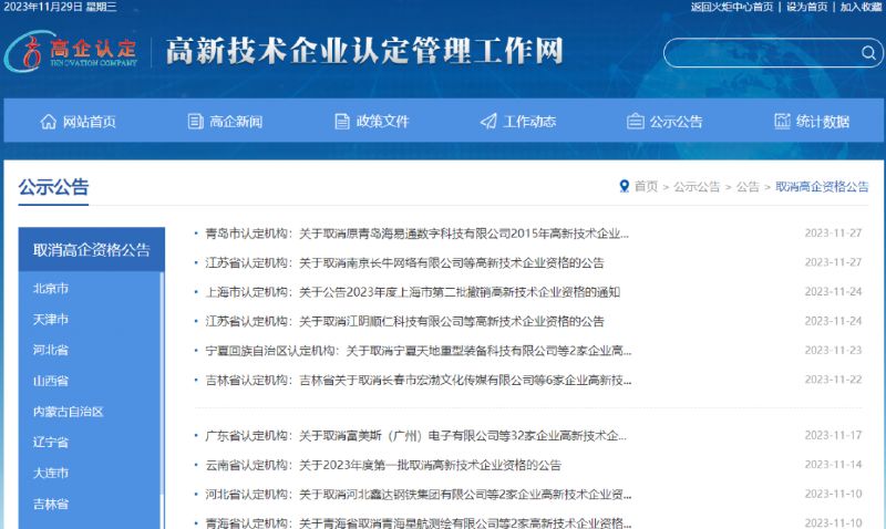 近日,小編統(tǒng)計(jì)了高新技術(shù)企業(yè)認(rèn)定管理工作網(wǎng)11月公布的被取消企業(yè)高新技術(shù)資格的公司名單。據(jù)統(tǒng)計(jì),共計(jì)248家企業(yè)被取消或撤銷(xiāo)企業(yè)高新技術(shù)資格。被取消企業(yè)高新技術(shù)資格的企業(yè)包括青海省2家、河北省2家、云南省3家、廣東省32家、吉林省6家、寧夏回族自治區(qū)2家、上海市79家、江蘇省121家、青島市1家。這說(shuō)明相關(guān)部門(mén)正在加緊對(duì)一些偽高企、假高企進(jìn)行事后核查。